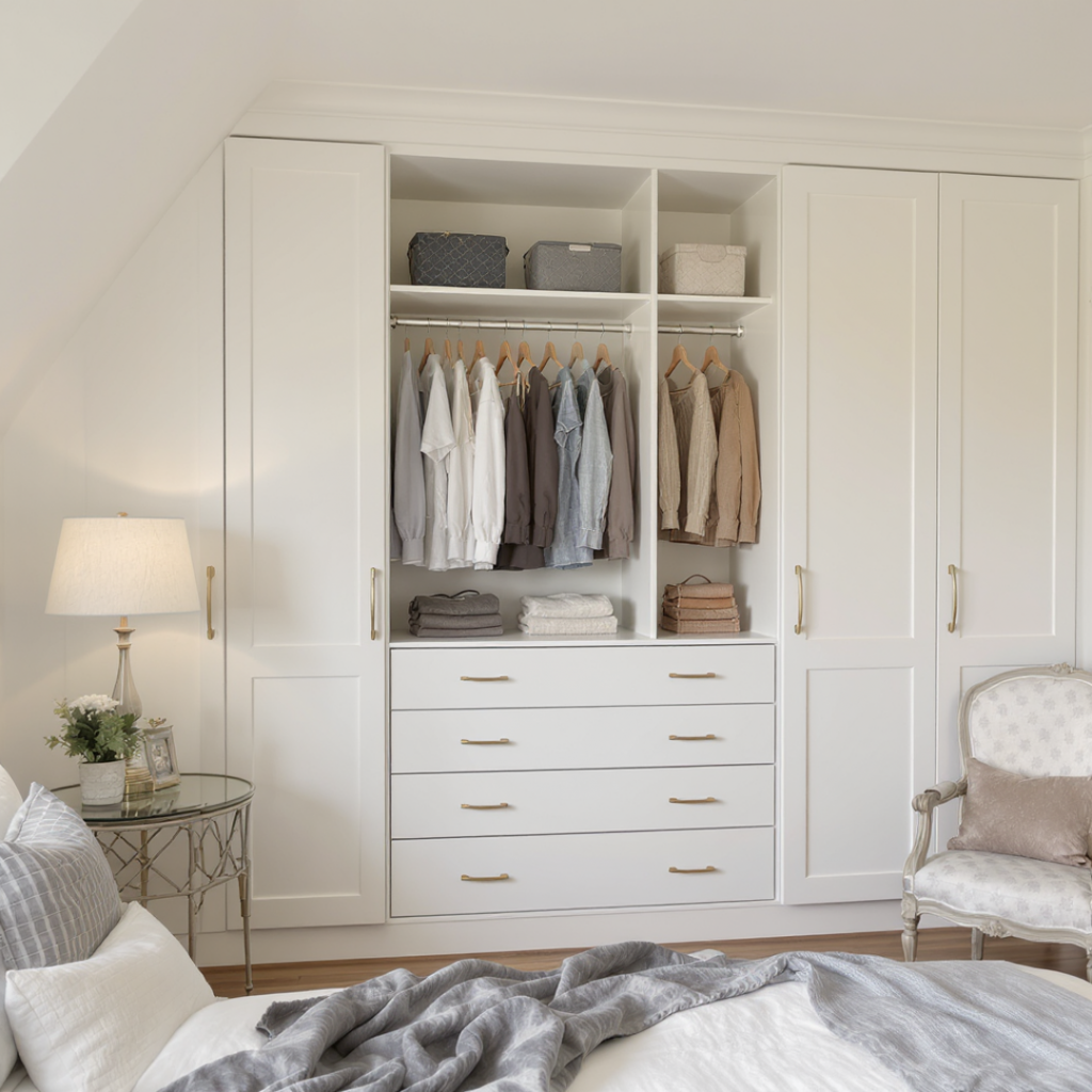 Your wardrobes are designed around how you actually use your space. Built to your exact room dimensions, each wardrobe features thoughtfully planned internal layouts with hanging rails, shelving, and drawer configurations tailored to what you need to store. We work with you to choose finishes that complement your bedroom, from painted styles to natural wood tones, and can integrate lighting, mirrors, and specialist storage for shoes, accessories, or awkward items. The result is a wardrobe that maximises every inch, looks beautiful, and makes getting dressed each day feel effortless. No wasted space, no compromise on quality.