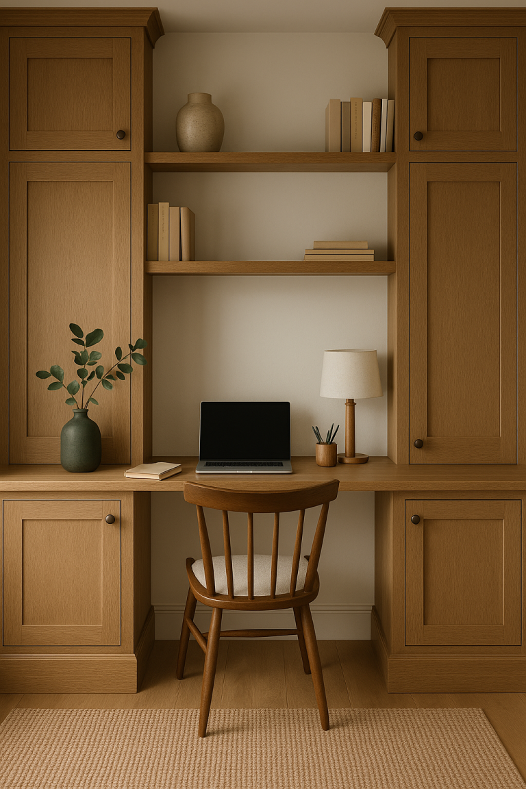 Home office solutions are designed to create productive, organized workspaces that fit perfectly into your home. Each fitted home office is built to your exact specifications, with clever desk arrangements, integrated shelving, and storage that keeps paperwork, equipment, and supplies neatly out of sight. We can incorporate cable management, adjustable shelving, filing systems, and display areas, all finished to complement your interior. Whether you’re converting a spare bedroom, utilizing an alcove, or creating a dedicated study, our custom home office furniture maximizes every inch while creating a calm, professional environment that helps you work at your best.
